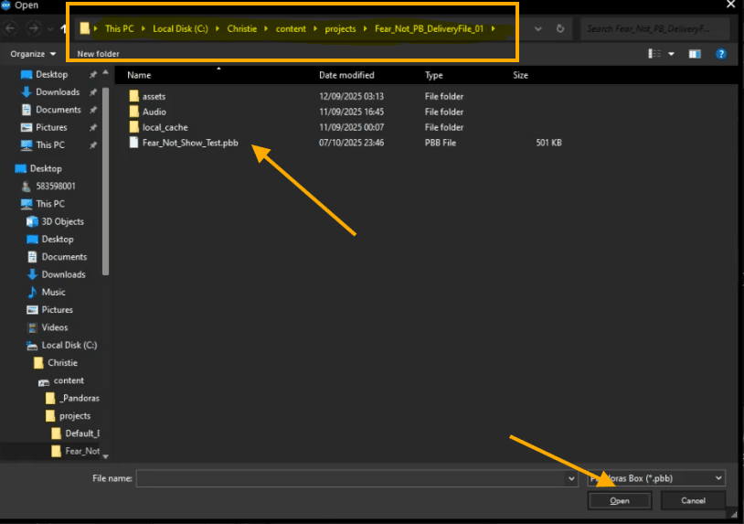 In the folder that appears "This PC/Local Disk (C:)/Christie/content/projects/, locate and open the correct project file
