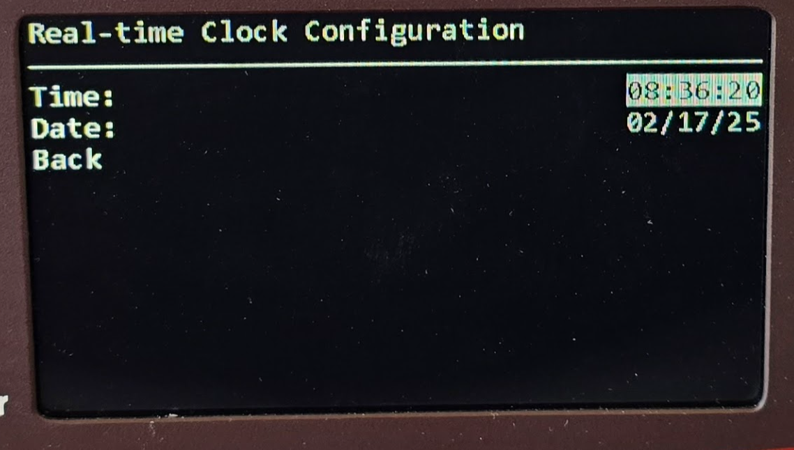 Rotate the wheel to highlight “Real-Time Clock” (or “Clock”). Press inward to enter the Clock Menu, showing options like “Time,” “Date,” and “RTC Config.”