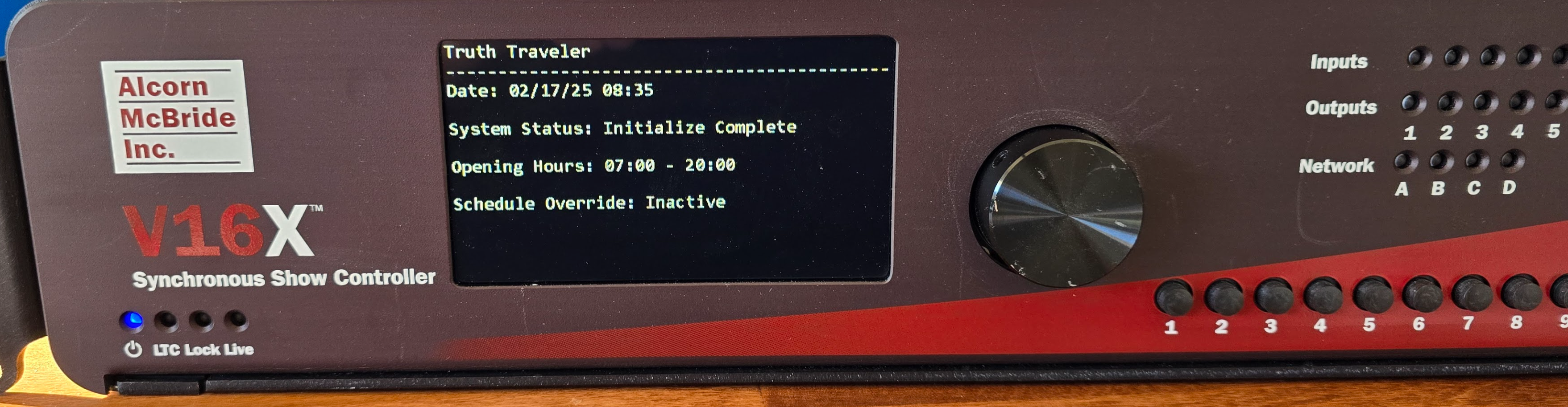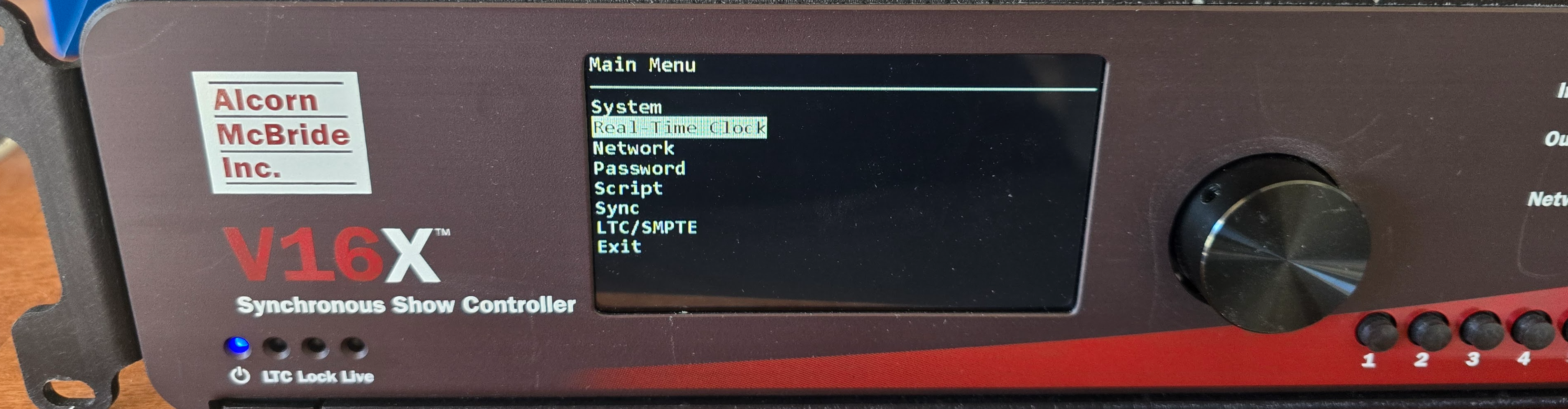 Locate the TFT display and navigation wheel on the V4X/V16X front panel. Ensure the device is on, showing the status screen (time, date, or show status).