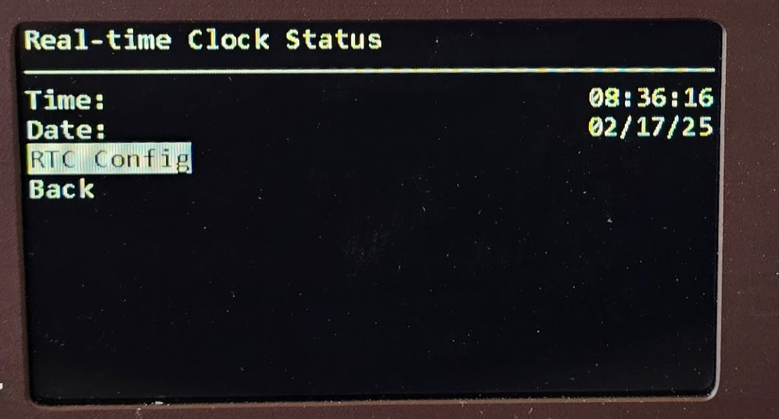 Rotate the wheel to select “RTC Config” and press inward. Editable fields for time (HH:MM:SS, 24-hour format) and date (MM/DD/YYYY) appear.